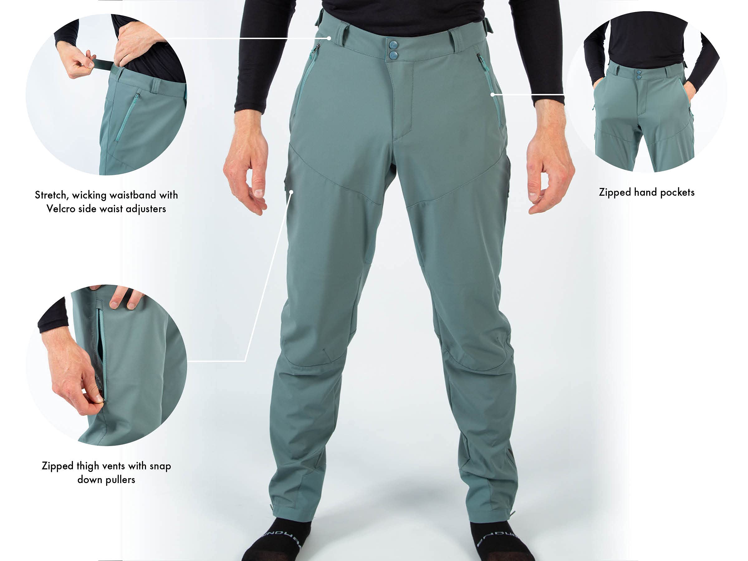 - Waterproof, 3 layer seam taped rear panels for tire spray protection. Stretch, wicking waistband with Velcro side waist adjusters